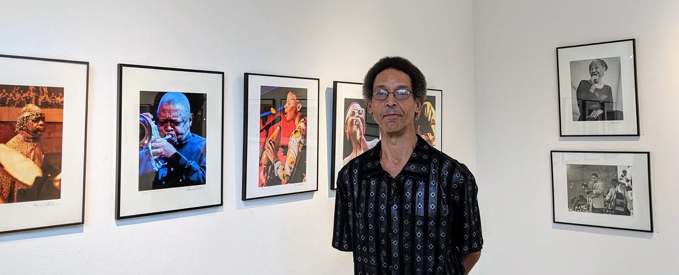 Maurice D. Robertson with some of his jazz images (credit Open Studio Hartford, Maurice D. Robertson)