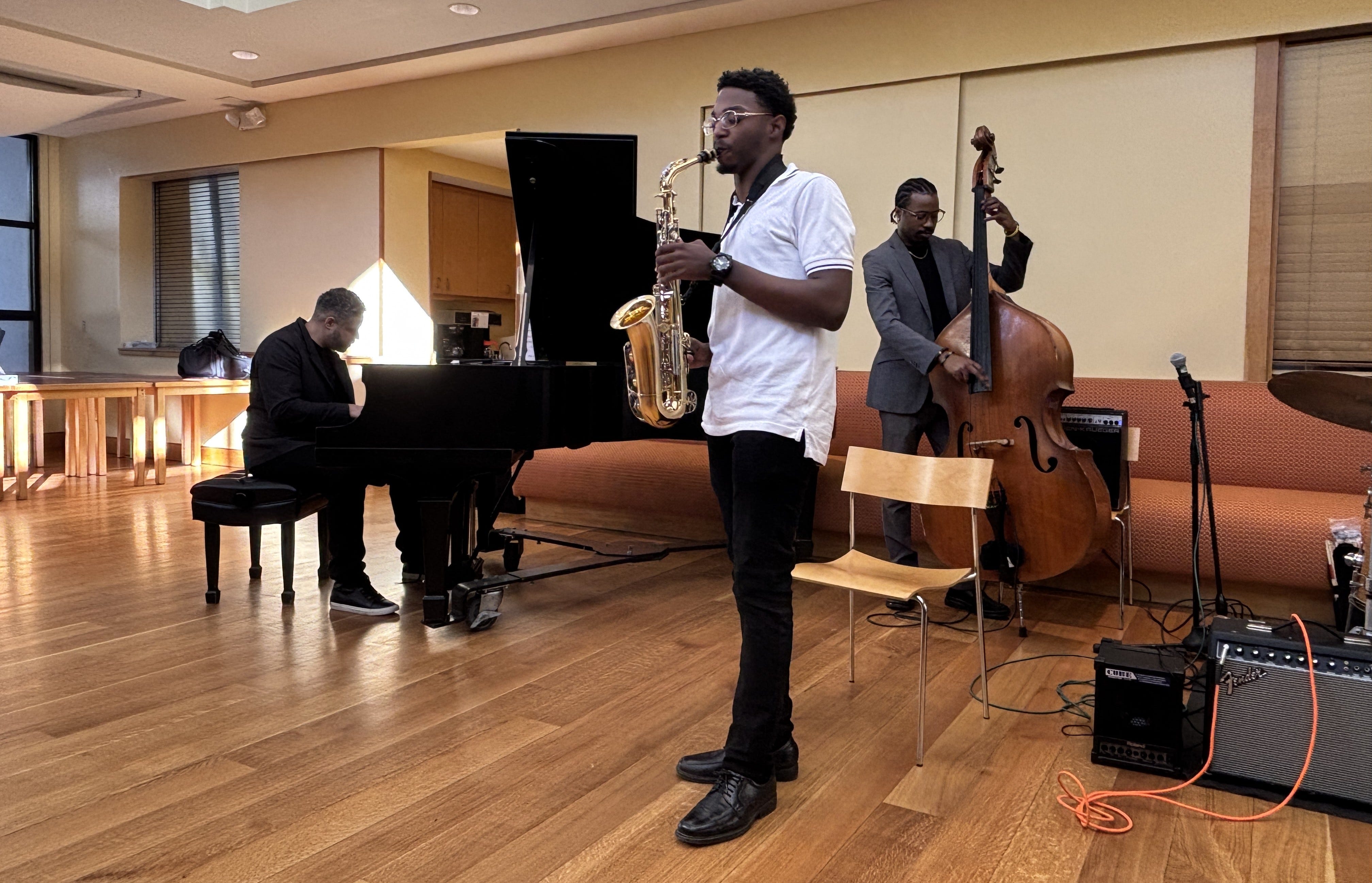 Alto saxophone player Dontae James, accompanied by 2025 Grammy winner Zaccai Curtis on piano and Conway Campbell on bass, won the 2025 Litchfield Jazz Camp Talent Search. Keep reading to find out how Dontae is carrying on the New Haven jazz tradition exemplified by the legendary Yale professor Willie Ruff, current Yale jazz ensembles director Wayne Escoffery, and other Elm City jazz mainstays. (8495Jazz photo)